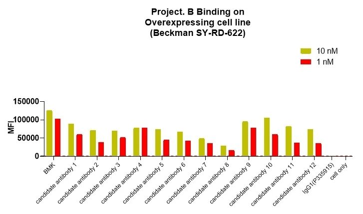 通过AI-STAL 2.0筛选获得的抗体候选分子大多具有较好的细胞水平结合活性。如图5展示了采用FACS分析候选抗体与抗原的亲和力测定结果,其中全部候选抗体与过表达细胞株均存在结合。