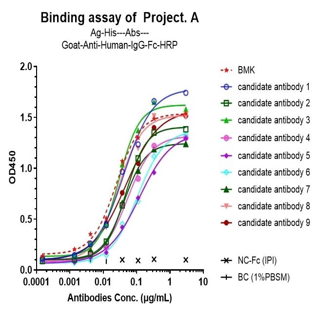 通过AI-STAL 2.0筛选获得的抗体候选分子大多具有较好的蛋白水平结合活性。如图4展示了采用ELISA分析候选抗体与抗原的亲和力测定结果,其中全部候选抗体均与抗原存在结合。