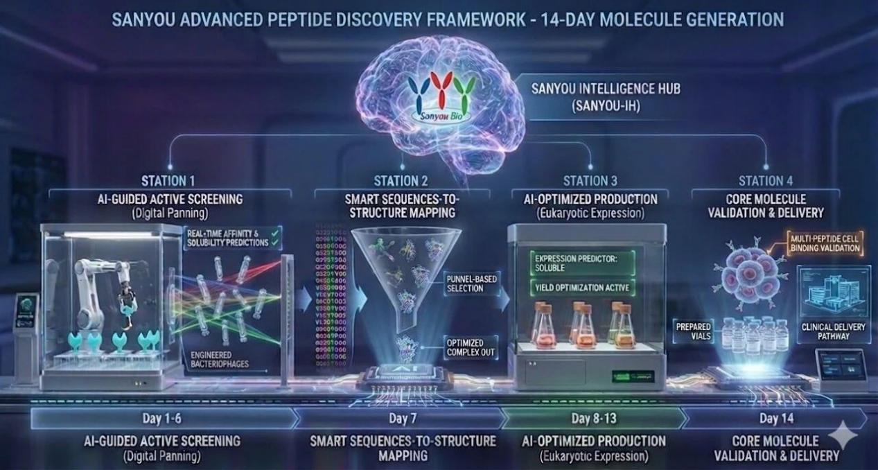 针对上述挑战,三优生物依托智慧中枢,正式推出适用于抗体、多肽、结合蛋白等多种分子类型的“14天先导分子发现流程”。该流程通过AI引导的数字筛选(Digital Panning)、智能化序列结构分析及真核优化生产体系,将文库海选到核心分子验证的全过程压缩至14天。这一方案的意义在于,它打破了传统生物实验的线性节奏,通过“干湿实验”深度闭环,不仅在极速时间内锁定了优质候选分子,更在早期阶段化解了成药性风险,为全球生物医药合作伙伴提供了从序列到验证分子的极致加速方案。